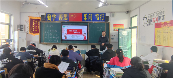 2月15日下午第三节课,九年级政治组孙来权老师在九年级(6)班开展了公开课。金年会金字招牌诚信政治组、历史组全体教师共同参与了本次公开课听课。本次一轮复习公开课课题为《民主与法治》,孙老师的课设计合理,课堂有效性强,板书设计以框架结构形式呈现,符合学生年龄特征。孙老师教态自然,语言流畅,课堂多注重鼓励学生,师生互动频繁,课堂氛围良好。民主话题的拓展延伸极大地调动了学生的积极性,学生参与其中,既能够学到道德与法治知识,又能够培养孩子们的政治认同感和法治观念。