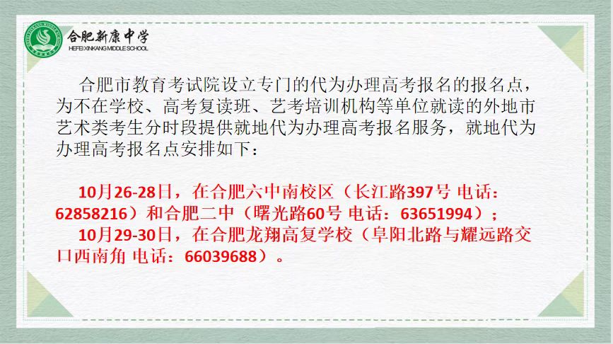 由于近期疫情形势复杂多变,按照合肥市教育局文件要求,现将我校2023年高考报名的办法调整如下:
